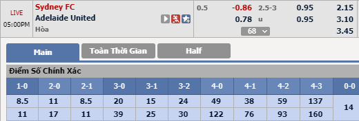 Trong khi đó, Adelaide Utd chỉ kém đội đứng thứ 3 với khoảng cách 4 điểm trong hoàn cảnh còn 2 vòng là vẫn đủ để họ hy vọng chiếm suất và giữ luôn tư cách ưu tiên ở vòng play-offs. Sự khác biệt về động lực thi đấu là rất rõ ràng nên các chỉ số châu Á kèm theo ở trận đấu này đang có chiều hướng nghiêng về đội khách. Mức kèo ngay từ đầu xuất hiện trên sàn giao dịch ở mức Sydney FC chấp 1/2 nhưng có điểm lợi nhuận bỏ rất sân là minh chứng rõ ràng nhất.