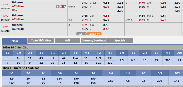Tổng bàn thắng cả trận: Nhà cái châu Á đã có xu hướng hạ thấp kèo tổng bàn thắng cả trận khi đưa về mốc 2 1/4 khá ít ỏi. Thực tế, rất khó để chờ đợi vào kịch bản tưng bừng bàn thắng khi Udinese đang trở nên thực dụng hơn, họ gia cố hàng thủ một cách chắc chắn trong nỗ lực cải thiện thành tích hiện nay. Trong khi đó, AC Milan vẫn chưa định hình được mẫu chân sút chủ lực của họ. Chọn Dưới 2 1/4 bàn cả trận.