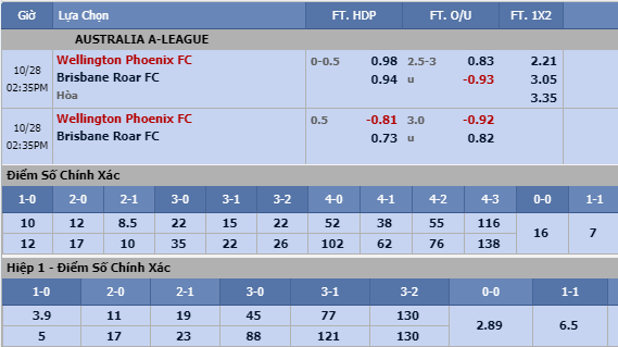 Cùng với thành tích khiêm tốn về chuyên môn, Wellington cũng trở nên đáng ngại cho nhà đầu tư châu Á trên khía cạnh tỷ lệ trên sàn giao dịch với phần lớn số trận phụ bạc lòng tin của giới mộ điệu. Bên cạnh đó, thành tích đối đầu gần đây cũng chứng kiến ưu thế nghiêng về Brisbane Roar khi họ bất bại tới 4 trong 5 lần chạm trán gần nhất và có 3 chiến thắng. Thậm chí, Wellington còn không ghi được bàn thắng nào trong 2 lần tiếp đón Brisbane Roar gần nhất tại A-League.