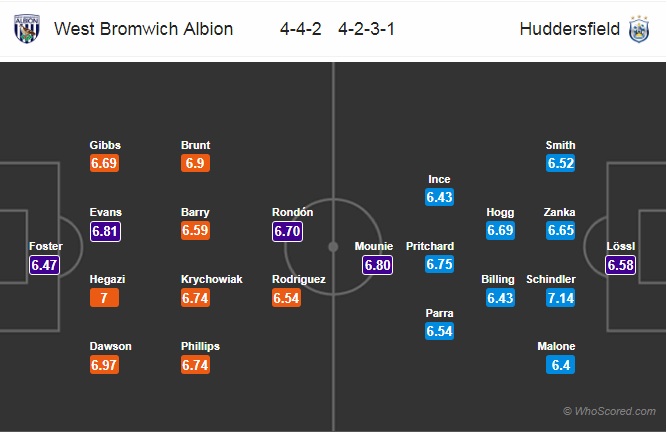 Huddersfield cũng đang ngấp nghé nhóm cầm đèn đỏ. Sau 27 vòng, đoàn quân của HLV David Wagner mới có 27 điểm, hơn vị trí xuống hạng gần nhất 1 điểm. Tuy nhiên, đội bóng tân binh đang cho thấy những nỗ lực nhằm trụ lại giải đấu cao nhất xứ mặt trời mọc, thể hiện qua việc vừa đả bại Bournemouth 4-1. Với quyết tâm vượt khó cùng tinh thần đang lên cao, Huddersfield sẽ đứng vững tại The Hawthorns.