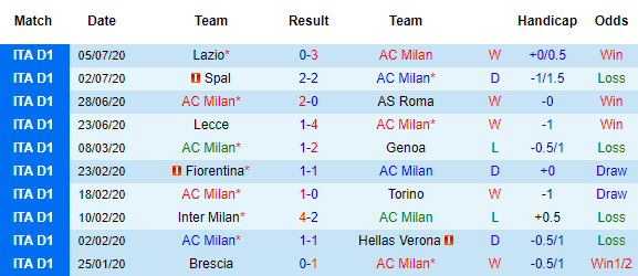 Kết quả 10 trận gần nhất của AC Milan ở giải VĐQG Italia