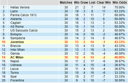 Trên bảng thành tích kèo châu Á mùa này, AC Milan đang gây thất vọng khá lớn khi mới chỉ giành được tỷ lệ thắng 40,00% và đứng ở vị trí thứ 14 trên BXH. Chính vì thế ở cuộc tiếp đón Juventus sắp tới, niềm tin dành cho thầy trò HLV Stefano Pioli là không nhiều. Điều này còn bởi tại San Siro, tỷ lệ thắng kèo của AC Milan đang còn tệ hơn khi mới chỉ có được tỷ lệ 21,43%.
