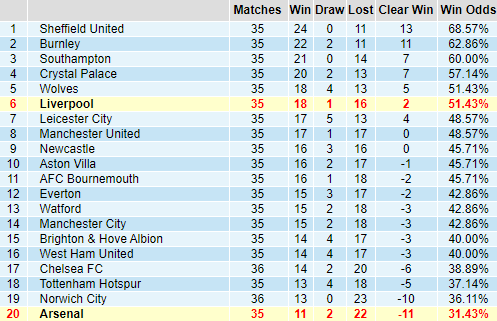 Nếu tính theo bảng thống kê thành tích kèo giải ngoại hạng Anh mùa này thì các pháo thủ mới đang là đội đứng cuối bảng. Arsenal hiện tại chỉ có tỷ lệ 31.43% thắng kèo sau 35 vòng đấu, trong khi đó Liverpool hiện đang xếp thứ 6 với 51.43% thắng kèo châu Á. Nếu tính kết quả trên sân nhà thì Arsenal thậm chí còn thảm hại hơn với chỉ 23.53 tỷ lệ thắng còn Liverpool có được 47.06% số trận thắng kèo mùa này.