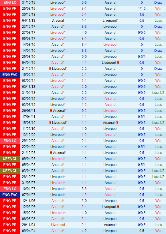 Ở thống kê đối đầu hai đội đang có thành tích tương đồng trên sàn giao dịch châu Á khi Arsenal giành chiến thắng 18 trận, Liverpool thắng 17 trận và hai đội hoà nhàu 4 trận trong tổng cộng 39 cuộc đối đầu gần nhất được niêm yết trên sàn giao dịch châu Á. Nếu chỉ tính thành tích trên sân nhà của Arsenal thì họ cũng không hơn đối thủ là mấy khi thằng 10 thua 8 và hoà 1 trong 19 lần tiếp đón Liverpool gần nhất.