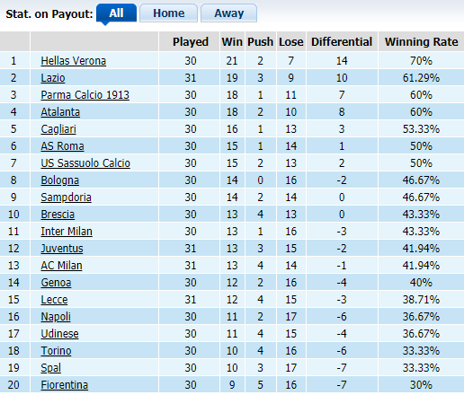 Trên BXH kèo tổng, AS Roma đứng thứ 6 với tỷ lệ thắng kèo đạt 50%, tức là cứ 2 trận thì họ có 1 lần thắng kèo. Trong khi ấy, ở phương diện này thì Parma nằm trong top 3 với tỷ lệ thắng kèo đạt 60%. AS Roma chơi không tốt trên sân nhà mùa này và sau 15 vòng tiếp khách, họ mới thắng kèo được 6 trận, đạt tỷ lệ 40%.