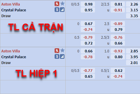 Với lợi thế sân nhà các cầu thủ Aston Villa đang được đánh cái đánh giá cao hơn đối thủ với tỷ lệ chấp 1/4 trên sàn giao dịch châu Á. Ở trận đấu tương tự gần nhất của hai đội cũng có cùng tỷ lệ chấp 1/4 nhưng Crystal Palace mới là đội cửa trên, trận đấu đó kết thúc chiến thắng tối thiếu 1-0 của đội chủ nhà Aston Villa.
