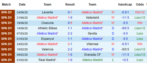 Bảng kèo 10 vòng gần nhất của Atletico Madrid