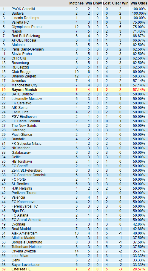 Tính tới thời điểm hiện tại hai đội đều đã thi đấu được 7 trận trong khuôn khổ Champions League mùa này. Hiện tại theo bảng thống kê thành tích kèo châu Á của giải đấu thì Bayern Munich đang giữ vị trí thứ 19 của giải đầu với tỷ lệ thắng kèo ở mức 57.14%, ở phía bên kia Chelsea có thành tích khiêm tốn hơn rất nhiều với chỉ 28.57% trận thắng kèo.