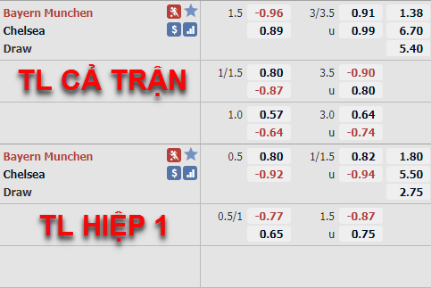 Trên sàn giao dịch châu Á thời điểm hiện tại Bayern Munich đang được nhà cái châu Á đánh giá ở của trên với tỷ lệ chấp 1 1/2 cho trận đấu này. Đây là tỷ lệ chấp rất cao của Hùm xám khi họ chỉ có tỷ lệ chấp 1/2 ở trận đấu lượt đi. Đây cũng là tỷ lệ chấp cao nhất của Bayern Munich dành cho Chelsea trong quá khứ đối đầu của hai đội, ở trận đấu tương tự gần nhất Bayern Munich chỉ có tỷ lệ chấp 3/4 và họ cũng không thể vượt qua rào cản của nhà cái khi chỉ có được kết quả hoà 1-1.
