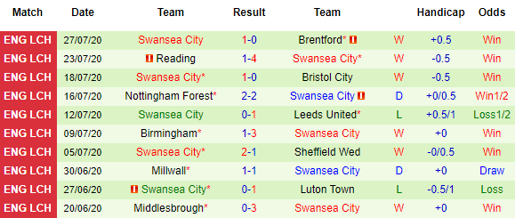 Trong 10 trận mới nhất, nếu như Brentford thắng/thua kèo 5 lần thì Swansea vượt qua rào cản tỷ lệ 7 trận, và chỉ thua kèo 2 lần. Xét về đối đầu thì Swansea đáng tin hơn khi có tới 8 lần thắng kèo trong 10 cuộc chạm trán gần đây giữa đôi bên. Nhìn chung là không chỉ nắm ưu thế sau chiến thắng ở lượt đi mà Swansea còn tỏ ra nhỉnh hơn Brentford ở góc độ chỉ số châu Á.