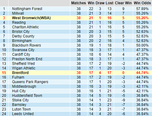 Giải hạng nhất Anh đã bước vào vòng 39. Vòng đấu này West Brom có chuyến làm khách đến sân của Brentford. Hiện tại West Brom đang giữ ngôi đầu BXH với 71 điểm và họ đang duy trì được khoảng cách 8 điểm với đội đứng thứ 4 cũng chính là đội chủ nhà trong trận đấu này.