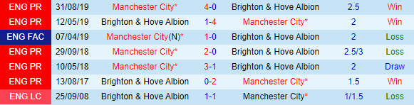 Ở thành tích đối đầu hai đội đang có kết quả tương đồng nếu tính trên sàn giao dịch châu Á, với 3 trận thắng 3 trận thua và 1 trận hoà trong tộng cộng 7 lần đối đầu gần nhất được niêm yết trên sàn giao dịch. Với những trận đấu diễn ra trên sân nhà Brighton thì Man City đang dẫn trước đối thủ khi thằng kèo 2 trong 3 trận đấu gần nhất.