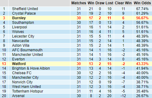 Burnley đang là đội nằm trong top 3 nếu tính trên bảng thống kê thành tích kèo của giải Ngoại hạng Anh với 56.67% tỷ lệ chiến thắng. Trong khi đó Watford xếp thứ 13 với 43.33% tỷ lệ thắng kèo. Watford có thành tích tồi hơn nếu chỉ tình trên sân khách, họ chỉ có 40% số trận thắng kèo khi không được thi đấu trên sân nhà.