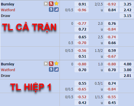 Trên sàn giao dịch châu Á đang xuất hiện tỷ lệ chấp 1/4 của đội khách trong trận đấu này. Đây là lần đầu tiên kể từ năm 2016 Watford được nhà cái đánh giá ở của trên khi làm khách của Burnley. Tỷ lệ chấp của Watford là hợp lý ở thời điểm này khi đội khách đang chịu sức ép lớn về mặt điểm số trong khi Burnley ngược lại.