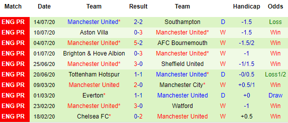 Bảng kèo 10 vòng gần nhất của Man Utd