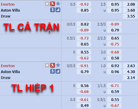 Trên sàn giao dịch châu Á ở thời điểm hiện tại Everton đang có tỷ lệ chấp 1/2 cho trận đấu này. Đây là tỷ lệ chấp tương đối thấp của đội chủ nhà, thông thường trong những trận đấu tương tự ở quá khứ Everton có tỷ lệ chấp khoảng 1 hoà. Ở lần làm khách gần nhất của Everton Aston Villa cũng được chấp với tỷ lệ 1 hoà và họ đã không thể gây khó khăn cho đối thủ khi hứng chịu thất bại 0-4.
