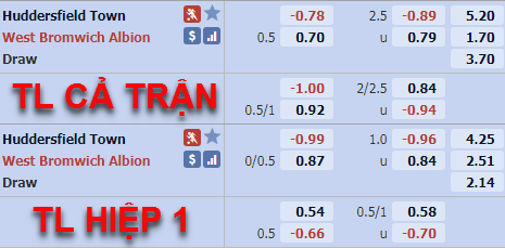 Trên sàn giao dịch châu Á ở thơi điểm hiện tại West Brom đang được đánh giá cao hơn với tỷ lệ chấp 3/4 cho trận đấu này. Đây là tỷ lệ tương đối cao của đội khách, ở trận đấu tương tự gần nhất hai được đánh giá tương động với tỷ lệ 0:0 và Huddersfield đã tận dung tốt lợi thế sân nhà của mình khi giành chiến thắng với tỷ số 1-0.