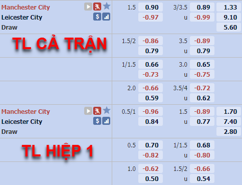 Trên sàn giao dịch châu Á hiện tại Man City đang có tỷ lệ chấp 1 1/2 và mức điểm ăn ít. Đây là mức tỷ lệ chấp thường thấy trong quá khứ đối đầu của hai đội, ở trận đấu tương tự gần nhất Man xanh cũng có tỷ lệ chấp tương tự và họ đã xuất sắc vượt kèo với chiến thắng 3-1.