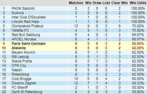 Tính tới thời điểm hiện tại 2 đội đều đã thi đấu được 8 trận tại UEFA Champions League và đang có tỷ lệ thắng trong top 10 của bảng thống kê thành tích kèo châu Á. Cả PSG và Atalanta đều đang có 62.50% tỷ lệ thắng kèo tại giải đấu lần lượt giữ vị trí thứ 9 và 10 trên BXH thành tích kèo châu Á.