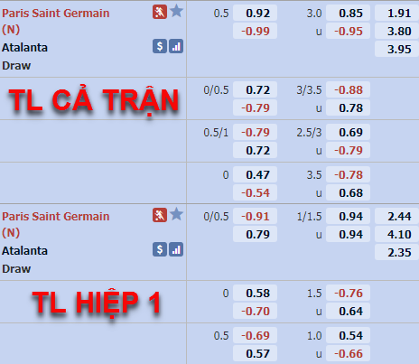 Trên sàn giao dịch ở thời điểm hiện tại PSG đang có tỷ lệ chấp 1/2 và mức điểm ăn ít. Đây là mức tỷ lệ tương đối hợp lý khi Atalanta có phong độ không tốt ở các vòng cuối Serie A trong khi PSG cũng không có nhiều cơ hội thi đấu đỉnh cao sau khi giải VĐQG Pháp đã kết thúc từ thời điểm tháng 3. Atalanta thua kèo liên tiếp 5 trận đấu gần nhất, PSG cũng không tốt hơn đối thủ là mấy khi thua kèo liên tiếp 3 trận gần nhất.