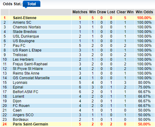 Dù vậy thì trên phương diện tỷ lệ, PSG lại không bằng Saint Etienne. Trải qua 5 trận đấu tại Cúp QG mùa này, PSG có 2 lần vượt rào cản handicap và 2 lần thua tỷ lệ (1 trận nhà cái không đưa ra kèo châu Á). Trong khi đó, qua 5 trận thì Saint Etienne toàn thắng về phương diện tỷ lệ châu Á, và đó là lý do vì sao họ lại có mặt ở trận chung kết này.