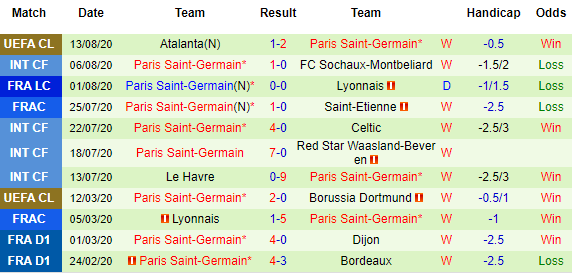 Trong 10 trận gần nhất thì RB Leipzig có 4 lần thắng kèo và 6 trận thua tỷ lệ. Còn với PSG, ở 10 trận mới đây mà nhà cái đưa ra đánh giá của mình thì PSG thắng kèo 6 trận và thua tỷ lệ 4 lần, như vậy là hơi ngược lại so với RB Leipzig. Trong quá khứ đôi bên mới gặp nhau 1 lần và khi ấy RB Leipzig là đội vượt rào cản handicap, nhưng nên nhớ đó chỉ là trận giao hữu.
