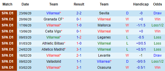 Bảng kèo 10 vòng gần nhất của Villarreal tại La Liga