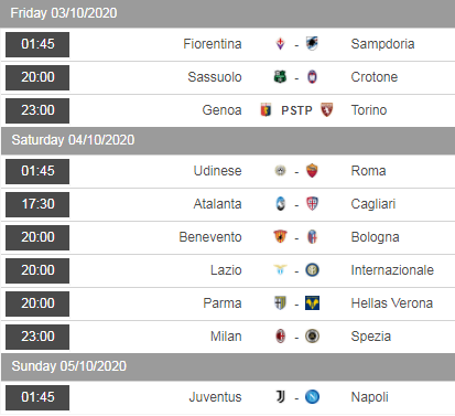 Cùng AEGOAL điểm qua lịch thi đấu, cập nhật tỷ lệ châu Á và một số trận đấu đáng chú ý vòng 3 giải VĐQG Italia - Serie A (2020-2021)