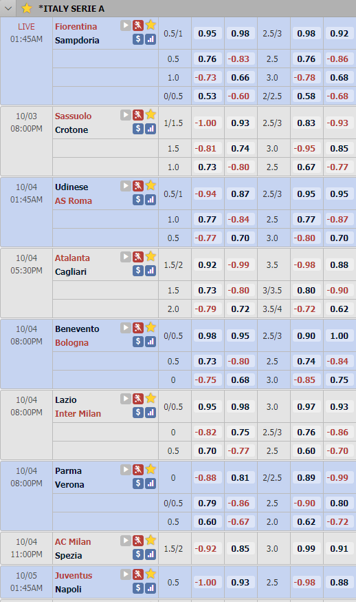 Cập nhật tỷ lệ châu Á vòng 3 giải VĐQG Italia - Serie A