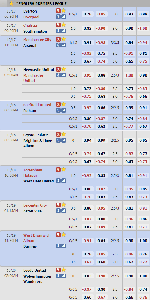 Cập nhật tỷ lệ châu Á vòng 5 giải Ngoại hạng Anh