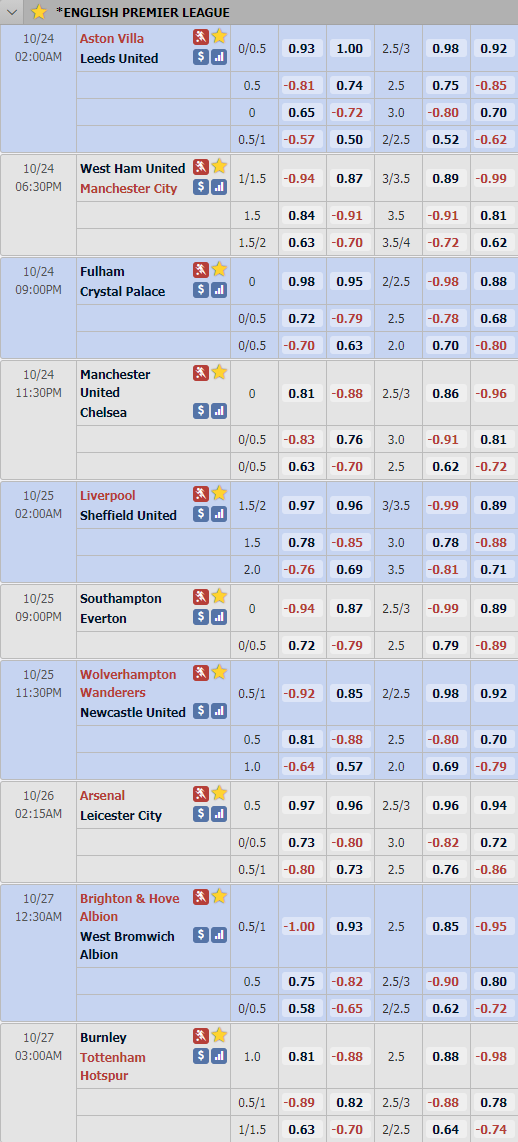 Cập nhật tỷ lệ châu Á vòng 6 giải Ngoại hạng Anh