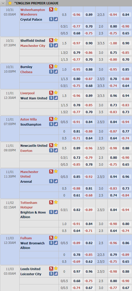 Cập nhật tỷ lệ châu Á vòng 7 giải Ngoại hạng Anh