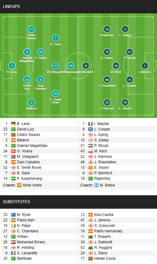 AEGoal cập nhật chính xác ĐỘI HÌNH RA SÂN trận Arsenal vs Leeds Utd diễn ra lúc 23h30 ngày 14/2 trong khuôn khổ vòng 24 giải Ngoại hạng Anh.