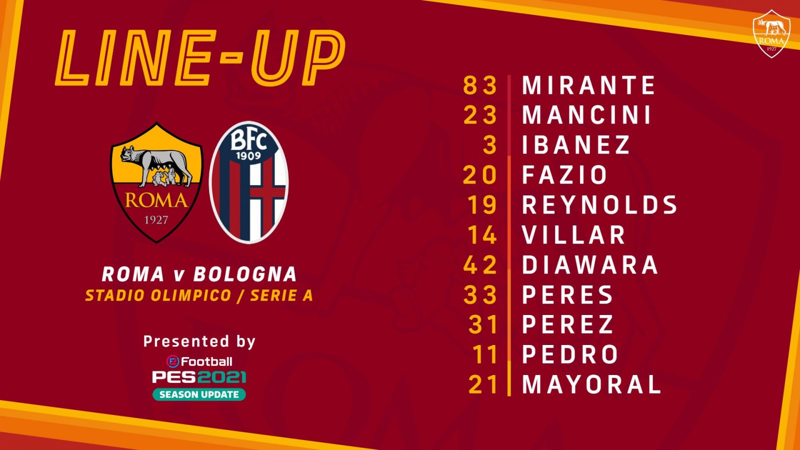 Roma (3-4-2-1): Paul Lopez - Mancini, Fazio, Ibanez - Karsdorp, Villar, Diawara, Calafiori - Carles Perez, Pellegrini - Borja Mayoral