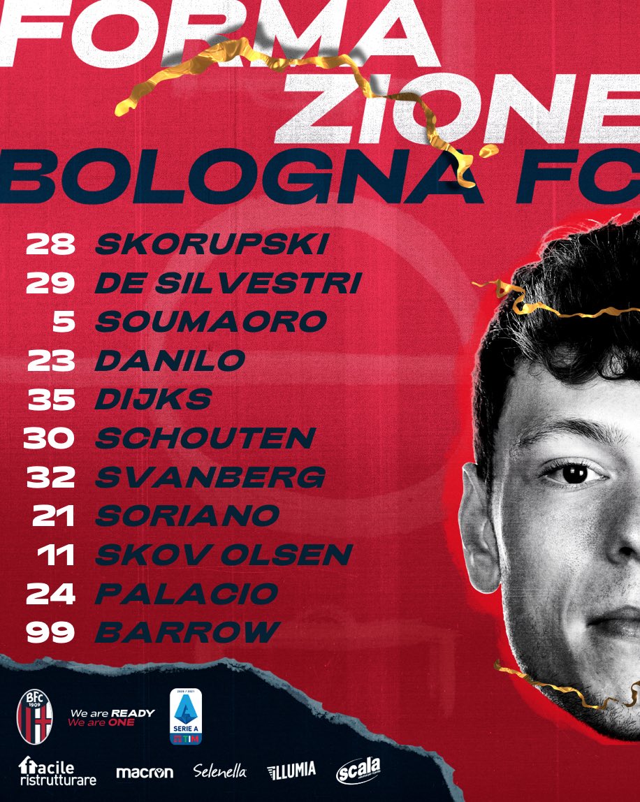 Bologna (4-2-3-1): Skorupski - De Silvestri, Danilo, Soumaoro, Dijks - Schouten, Svanberg - Skov Olsen, Soriano, Barrow – Palacio