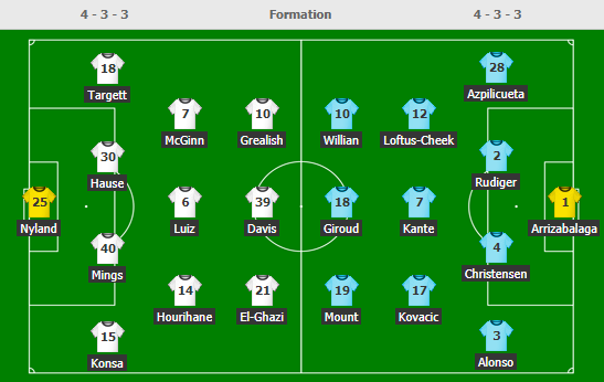AEGoal.net cập nhật chính xác ĐỘI HÌNH RA SÂN trận Aston Villa vs Chelsea diễn ra lúc 22h15 ngày 21/6 trong khuôn khổ Vòng 30 - Ngoại hạng Anh.