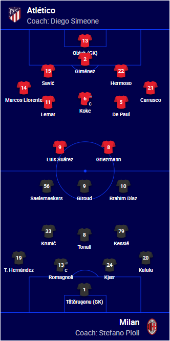 AEGoal cập nhật chính xác ĐỘI HÌNH RA SÂN trận Atletico Madrid vs AC Milan diễn ra lúc 03h00 ngày 25/11 trong khuôn khổ vòng bảng cúp C1 châu Âu.