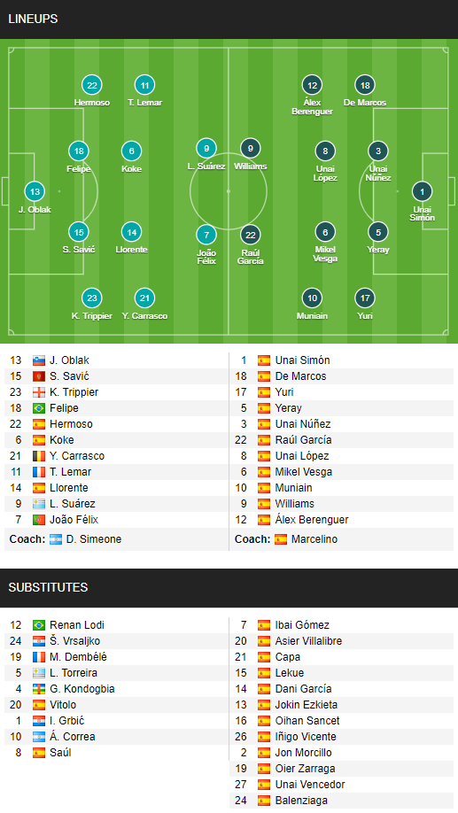 ĐỘI HÌNH RA SÂN trận Atletico Madrid vs Bilbao, 01h00 ngày 11/03: VĐQG Tây Ban Nha