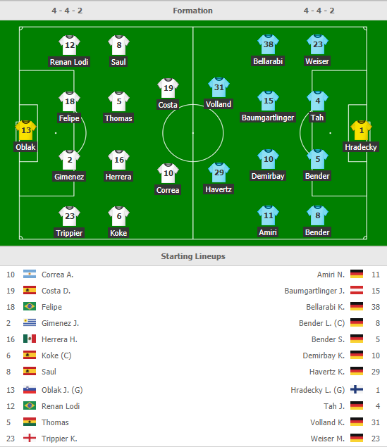 AEGoal.net cập nhật chính xác ĐỘI HÌNH RA SÂN trận Aletico Madrid vs Leverkusen diễn ra lúc 23h55 ngày 22/10 trong khuôn khổ Bảng D - UEFA Champions League.