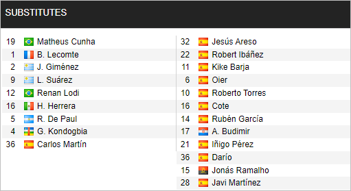 * Danh sách dự bị trận Atletico Madrid vs Osasuna, 00h30 ngày 21/11: VĐQG Tây Ban Nha