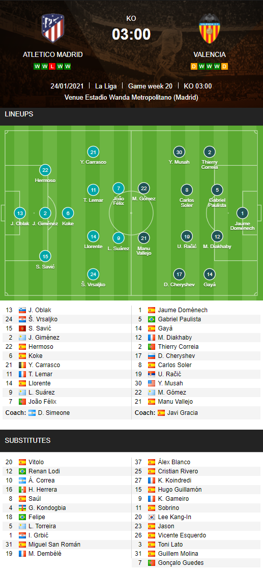 AEGoal cập nhật chính xác ĐỘI HÌNH RA SÂN trận Atletico Madrid vs Valencia diễn ra lúc 03h00 ngày 25/01 trong khuôn khổ giải VĐQG Tây Ban Nha.