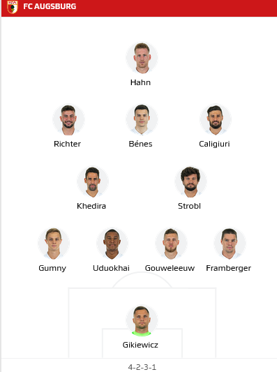 Augsburg: Gikiewicz - Framberger, Gouweleeuw (c), Uduokhai, Pedersen - Strobl, Gruezo - Caligiuri, Benes, Hahn - Niederlechner.