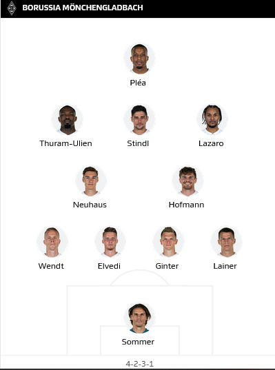 Gladbach: Sommer - Lainer, Ginter, Elvedi, Wendt - Zakaria, Neuhaus - Hofmann, Stindl (c), Thuram - Embolo.