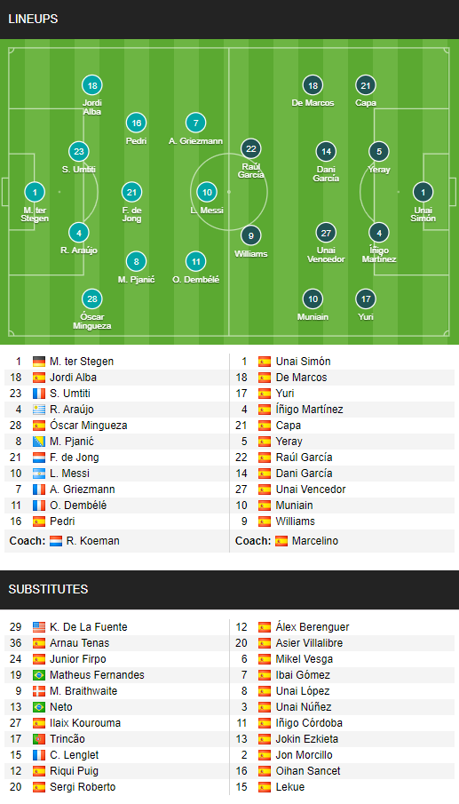 - Barcelona: Vắng Ansu Fati, Gerard Pique, Philippe Coutinho (chấn thương) và Sergio Busquets (treo giò); Khả năng ra sân của Sergi Roberto còn bỏ ngỏ.