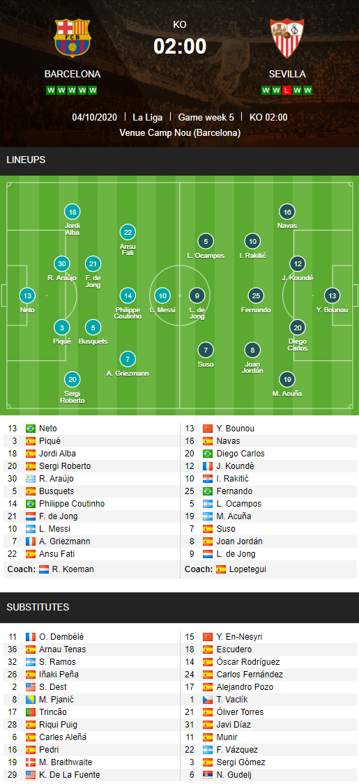 AEGoal.net cập nhật chính xác ĐỘI HÌNH RA SÂN trận Barcelona vs Sevilla diễn ra lúc 02h00 ngày 05/10 trong khuôn khổ Vòng 5 - VĐQG Tây Ban Nha