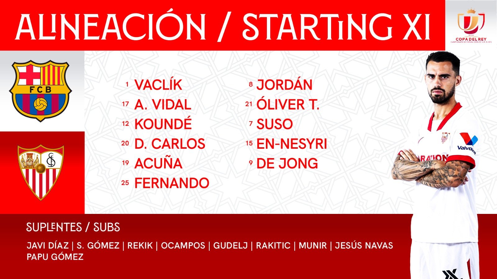 Sevilla (4-3-3): Bounou - Navas, Kounde, Carlos, Vidal - Rakitic, Gudelj, Jordan - Torres, En-Nesyri, Suso