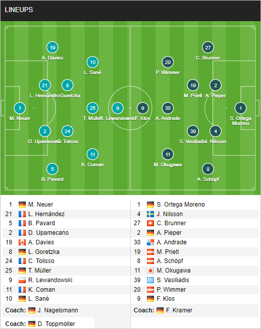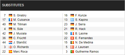 - Bayern Munich: Marcel Sabitzer, Tanguy Nianzou và Bouna Sarr vắng mặt vì chấn thương; Choupo-Moting và Joshua Kimmich dương tính với Covid-19; còn Alphonso Davies, Michaal Cuisance, Jamal Musiala, Gnabry, Goretzka và Lucas Hernandez vẫn chưa chắc chắn ra sân.