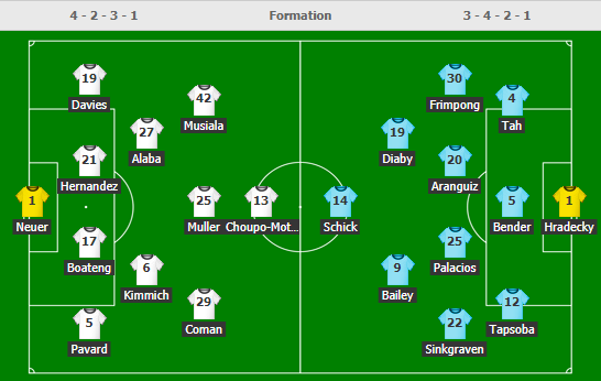 - Bayern Munich: Vắng Douglas Costa, Tolisso, Sule, Lewandowski và Marc Roca (chấn thương); Khả năng ra sân của Nianzou, Gnabry, Goretzka và Lucas Hernandez còn bỏ ngỏ.