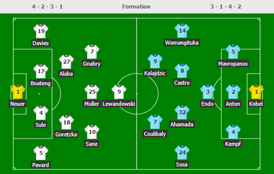 - Bayern Munich(4-2-3-1): Neuer (c) - Pavard, Boateng, Alaba, Davies - Kimmich, Goretzka - Sane, Muller, Gnabry - Lewandowski