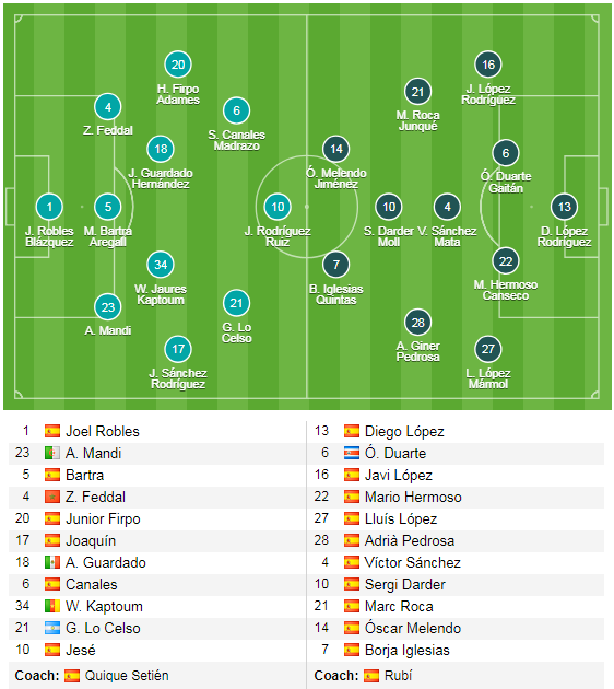 Betis (4-3-3): Lopez - Firpo, Bartra, Sidnei, Mandi - Celso, Guardado, Canales - Tello, Jese, Joaquin